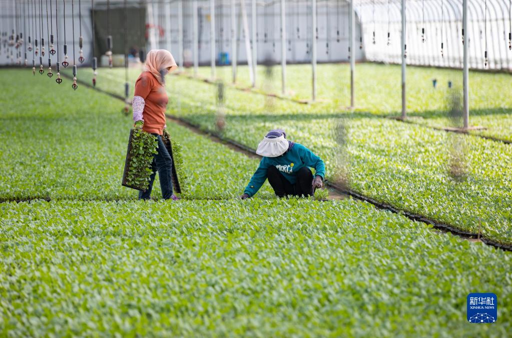 3月8日,农民在宁夏贺兰县隆源村的蔬菜种植园区育苗棚内劳作。
