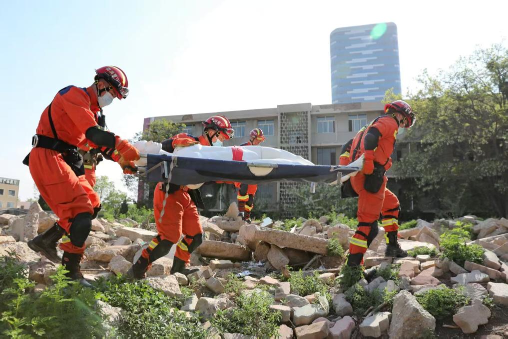 地震救援科目上,以“锤炼技术、精准协同、联合制胜”为目标,设置浅、中、深三级模拟埋压点位,重点开展作业现场评估、大面积坍塌人犬搜寻、生命迹象探测定位、狭小空间向下破拆救援、水平支撑巷道破拆救援、绳索救援及车辆事故处置等实战科目,从难从严检验指战员“初战指挥、多队联战、协同联动、安全管控、综合保障”五种能力。