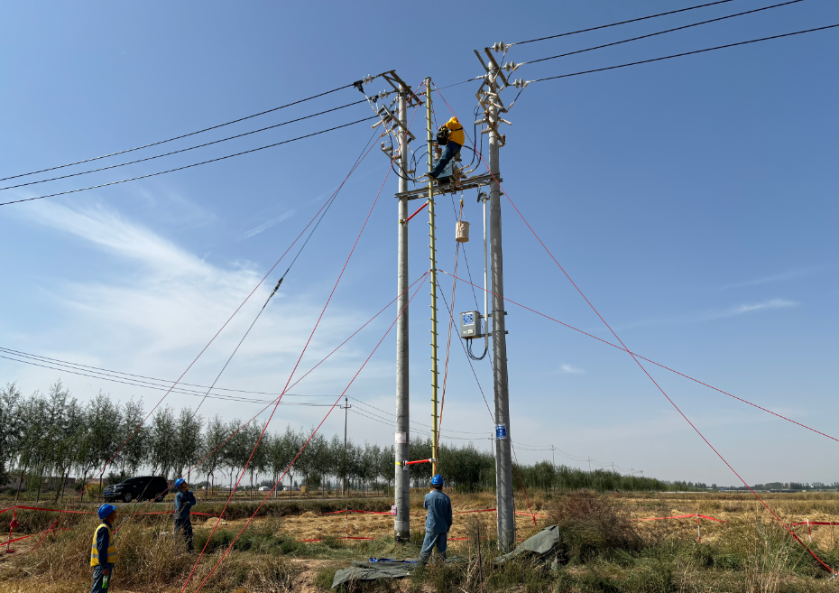 作业过程中,带电作业班成员在农田中对“蜈蚣梯”进行定位打桩、逐节组装并用绝缘缆风绳固定,将近12米高的“蜈蚣梯”平稳立在目标杆位附近。作业人员依托“蜈蚣梯”的稳定支撑,在高空对故障设备进行了精准、高效的带电更换,实现了对联络开关的不停电检修,保障了线路之间的正常负荷转供能力,避免了因设备故障可能导致的用户停电,确保了区域电网的连续稳定运行。