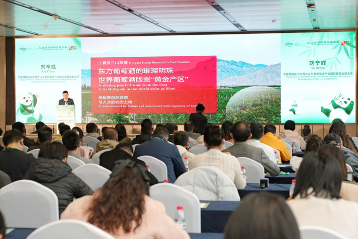 11月21日,在四川成都举办的“2025全球熊猫伙伴大会·宁夏特色农产品推介活动”上,宁夏贺兰山东麓葡萄酒产业园区管委会副主任刘辛彧向与会嘉宾作推介。他表示,贺兰山东麓葡萄酒产区正以“山河共酿、匠心独运”的东方风骨跻身世界葡萄酒版图,成为一张彰显中国品质、传递文化自信的“紫色名片”。