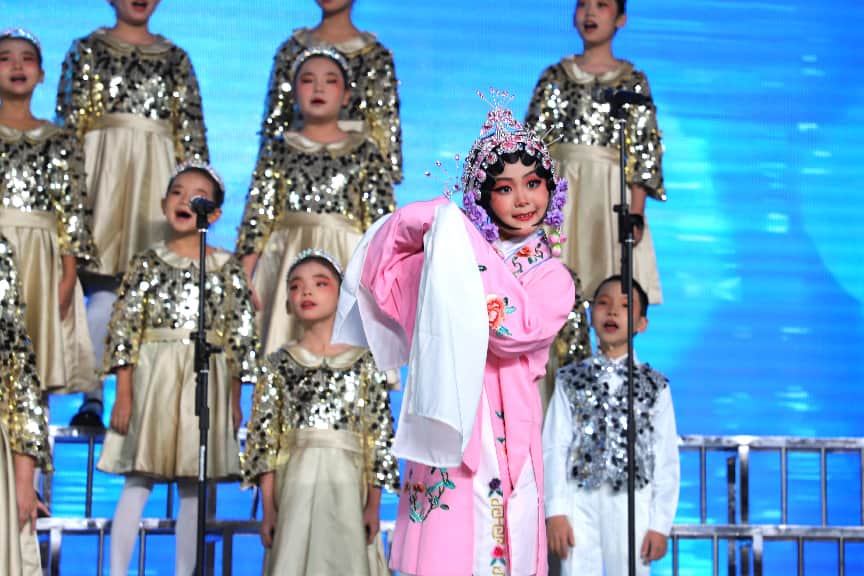 孩子们身着绚丽的演出服,脸上洋溢着自信的笑容,以饱满的热情、嘹亮的歌声,演绎了《红星歌》《唱支山歌给党听》《山河》《梨花又开放》等经典曲目。时而悠扬婉转,如清泉流淌,诉说着对祖国热土的深深眷恋;时而铿锵有力,似号角吹响,传递着新时代少年的壮志豪情。和声错落有致,声部层次分明,稚嫩的童声交织成动人的旋律,回荡在赛场的每一个角落。
