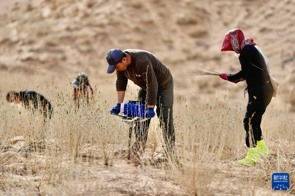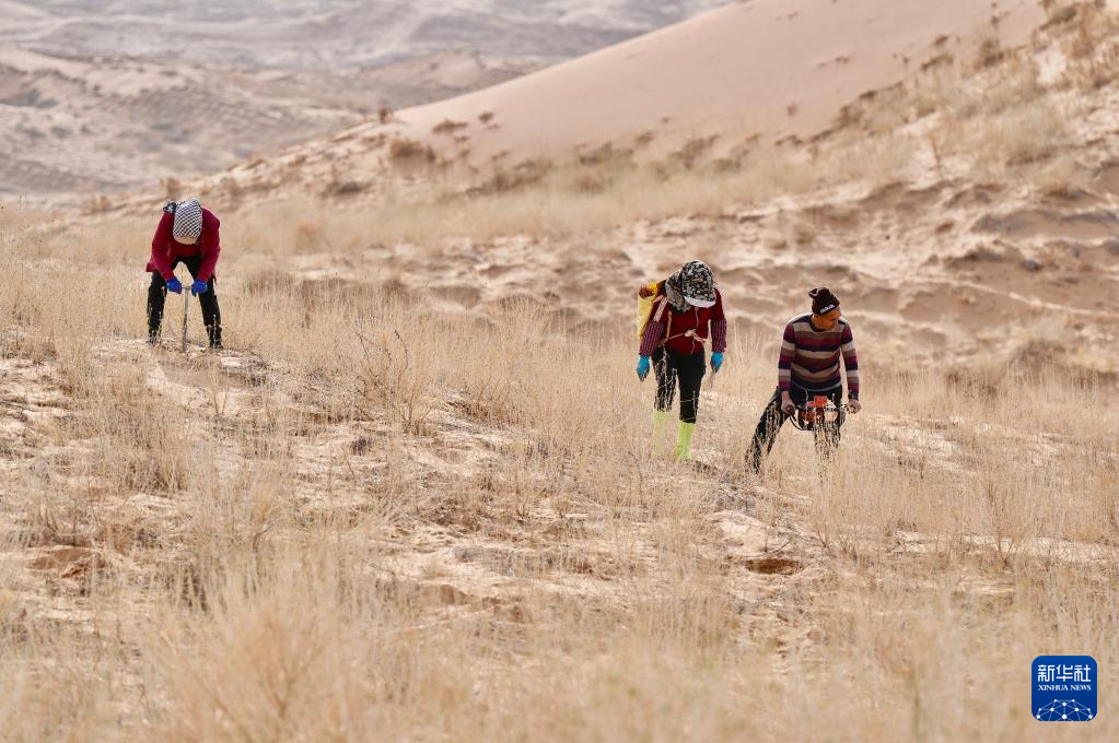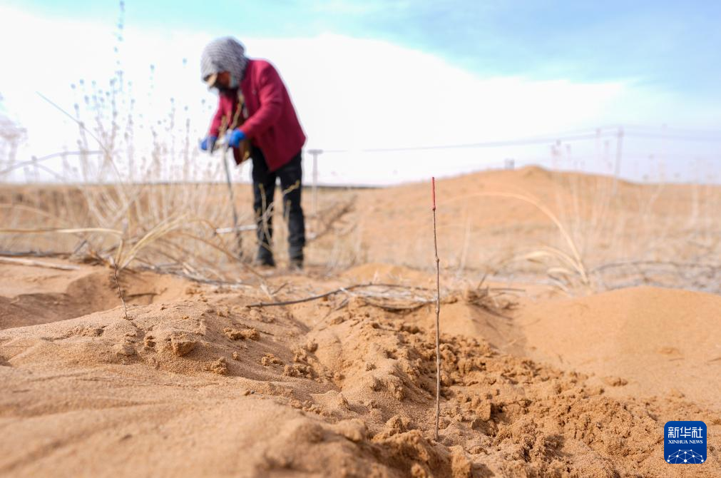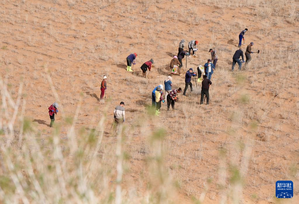 近日,随着天气转暖,宁夏中卫市组织治沙工人开展宁夏境内腾格里沙漠固沙锁边带补种补植工作,通过及时补种耐旱沙生植物,不断巩固治沙成果,筑牢黄河上游生态屏障。新华社记者 杨植森 摄