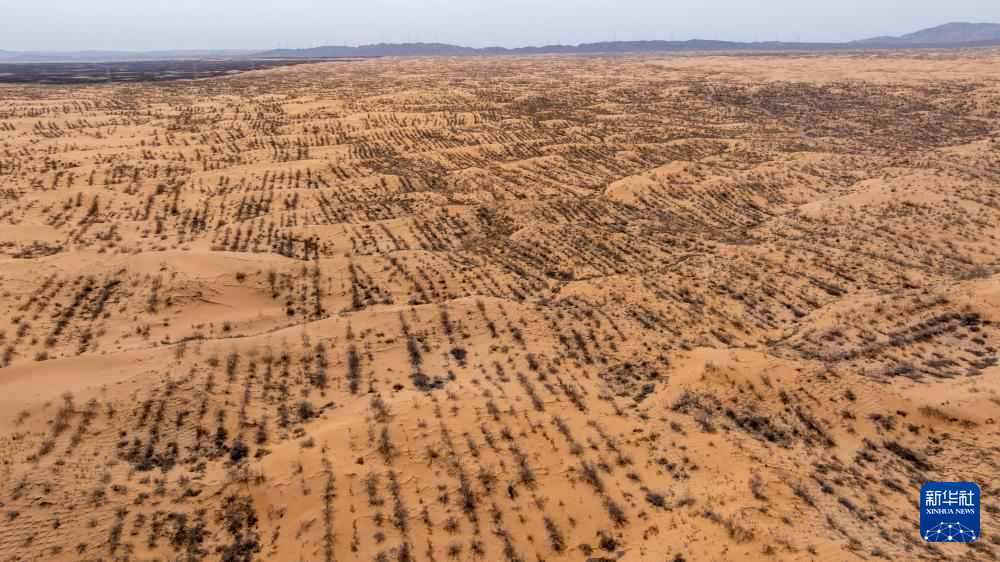 这是在宁夏中卫市国有林业总场长流水管理站腾格里沙漠东南缘拍摄的经过治理的大片沙丘(4月10日摄,无人机照片)。新华社记者 杨植森 摄