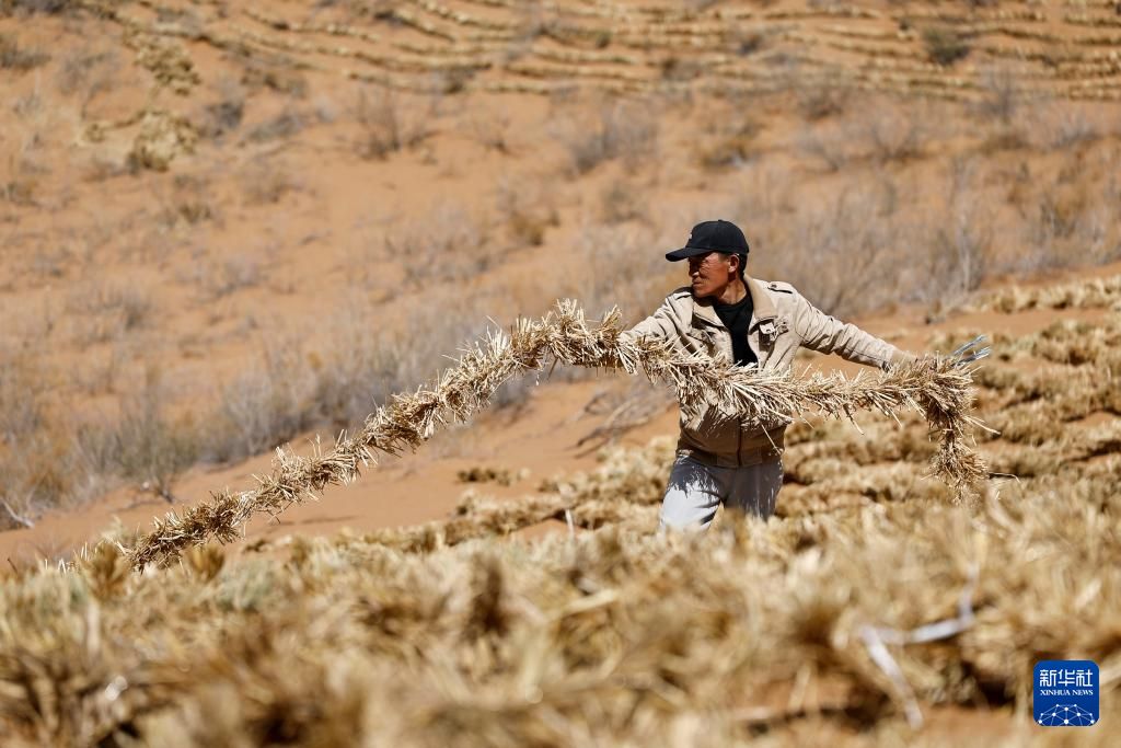 据介绍,传统草方格2到3年就会风化,而“刷状网绳式草方格沙障”使用寿命为5到6年,装置工作效率比人工扎设草方格工作效率提高60%,并可实现工业化量产,近年来在宁夏中卫市逐步得到推广。新华社记者 杨植森 摄