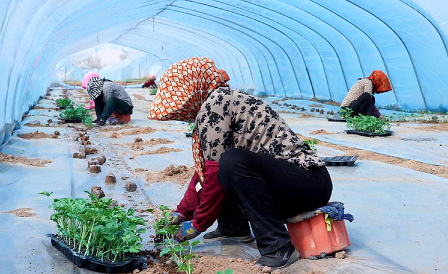 乘着融融春光,走进宁夏吴忠市利通区金银滩镇的特色瓜果种植片区,一栋栋温棚内工人正忙着移栽瓜苗,他们依次完成打孔、放苗、移栽、培土等环节,动作娴熟、有条不紊。