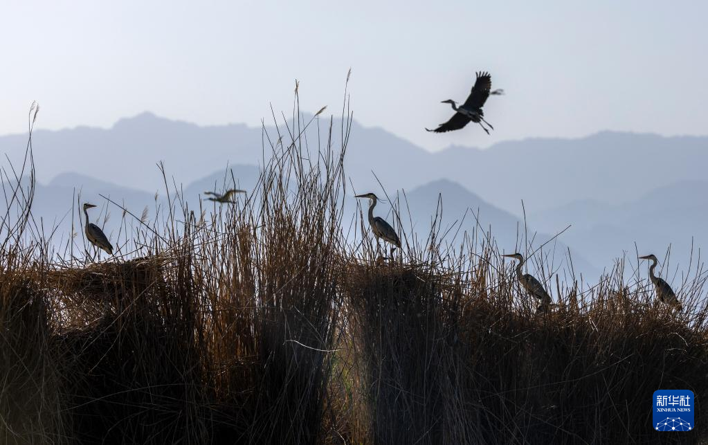 4月18日,苍鹭在沙湖芦苇丛中栖息、飞翔。新华社记者 王鹏 摄