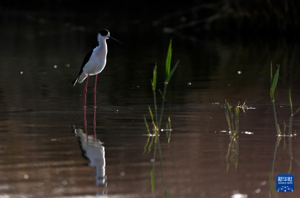4月18日,一只黑翅长脚鹬在沙湖水域中觅食。新华社记者 王鹏 摄