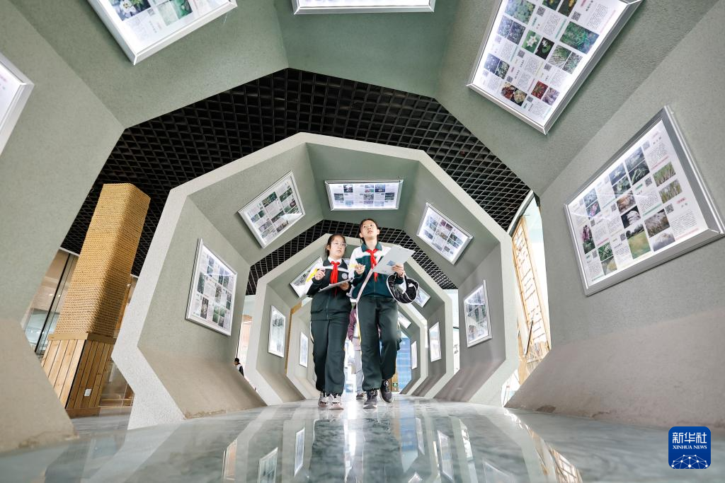 4月22日,在宁夏银川市鸣翠湖国家湿地公园,银川市兴庆区实验第二小学学生在参观自然科普展览。