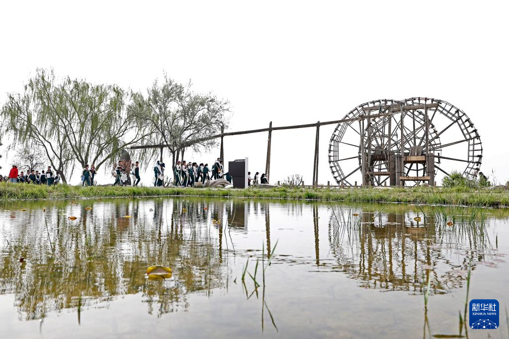 4月22日,在宁夏银川市鸣翠湖国家湿地公园,银川市兴庆区实验第二小学学生在参观湿地景观。