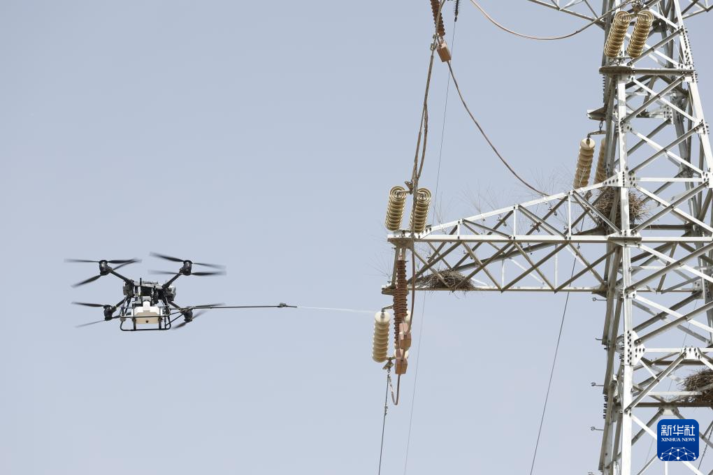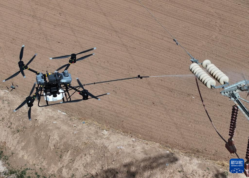 为应对春季沙尘天气对电网运行稳定带来的安全隐患,国网银川供电公司输电运检中心开展供电线路瓷质绝缘子串无人机冲洗作业。