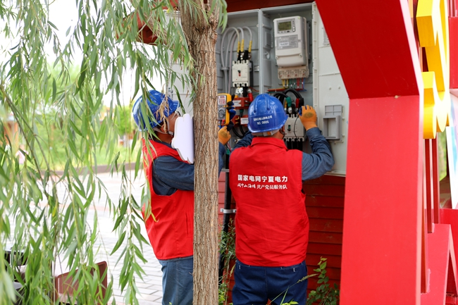 9月11日,在宁夏石嘴山市银河村,国网石嘴山供电公司工作人员正对景区供电高低压设施进行雨后专项特巡。在供电的有力保障下,银河村大力发展种植养殖一体化富民产业,拓展自然旅游观光业。