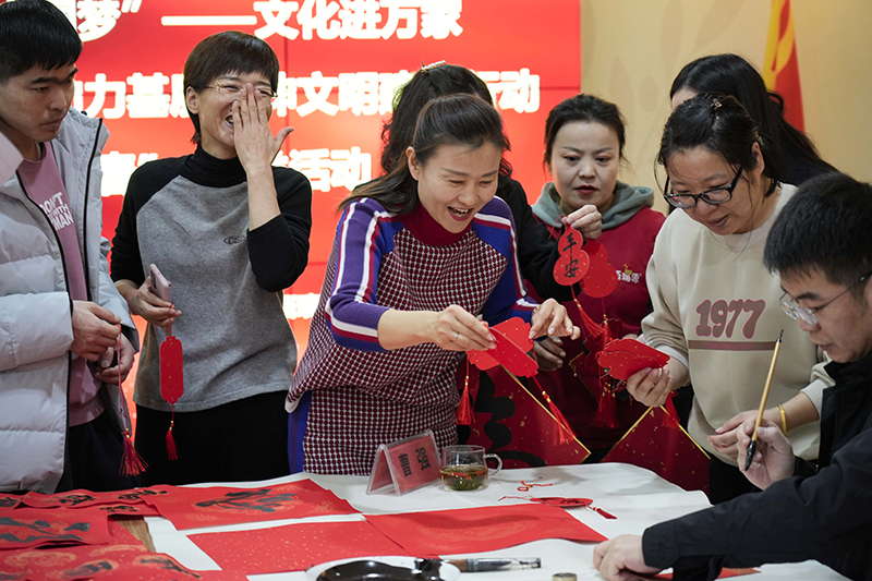 翰墨飘香迎新春、丹青溢彩送祝福。一副副书法作品或雄浑厚重、或刚柔并济……楷、行、隶、草各具特色,一笔一划都勾勒出对美好生活的祝福,令百瑞源人赞叹不已。