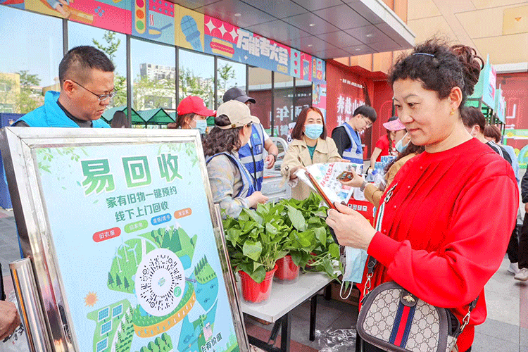 4月27日,在石嘴山市大武口区万达广场1号门前,一场以“以旧换新 绿色低碳 悦享幸福生活新期待”为主题的以旧换新公益市集活动热闹非凡。