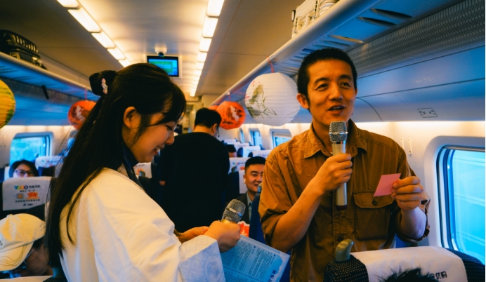 9月13日,中秋佳节来临之际,在银川开往敦煌的D2749次列车上,一场以“文明出行、诗话团圆”为主题的中秋诗会正在上演,列车工作人员和旅客们一起以诗会友、欣赏节目,共同感受中华传统文化的魅力。