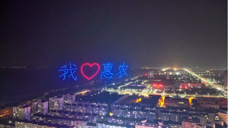 当天晚上7点,惠动全城第十一届东大街购物节暨2024惠购直播电商节在无人机表演秀《礼赞惠农》中拉开序幕。260架无人机组成飞行方队飞向天空,“惠动全城”“我爱惠农”以及八角楼等变幻的图形和光影效果,将夜空装点得绚丽多彩,市民纷纷拿出手机记录这一时刻。