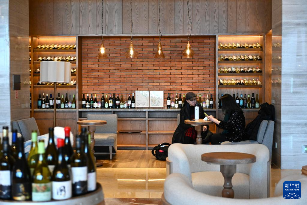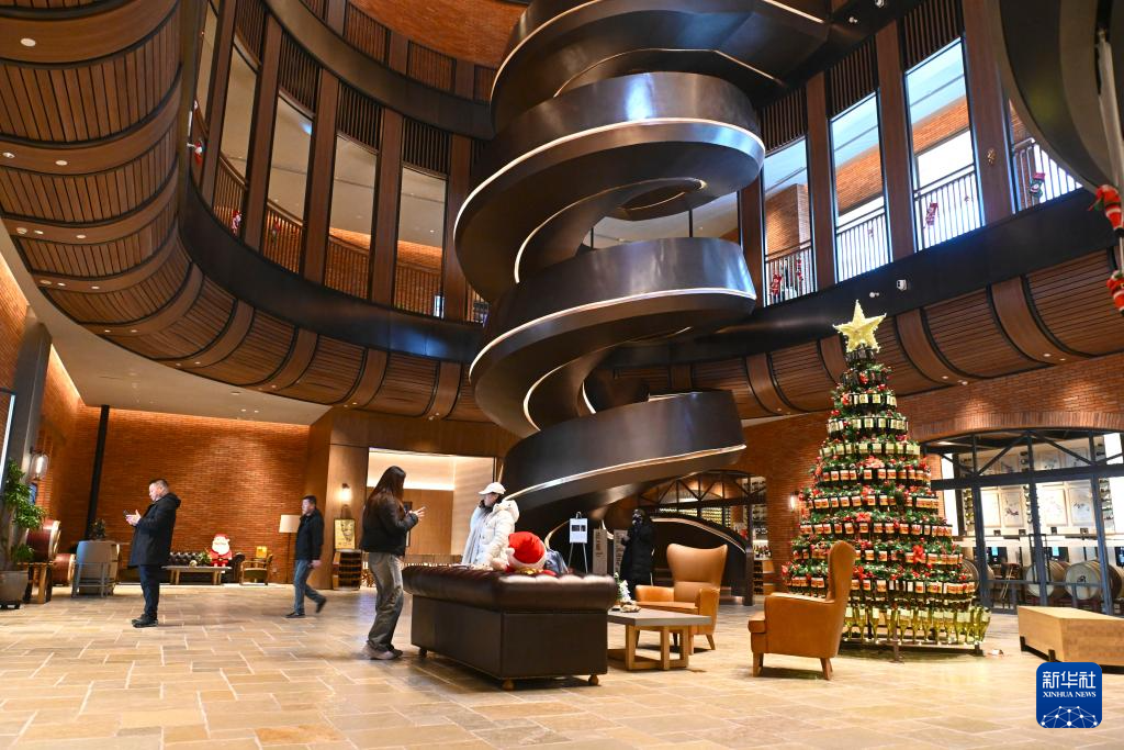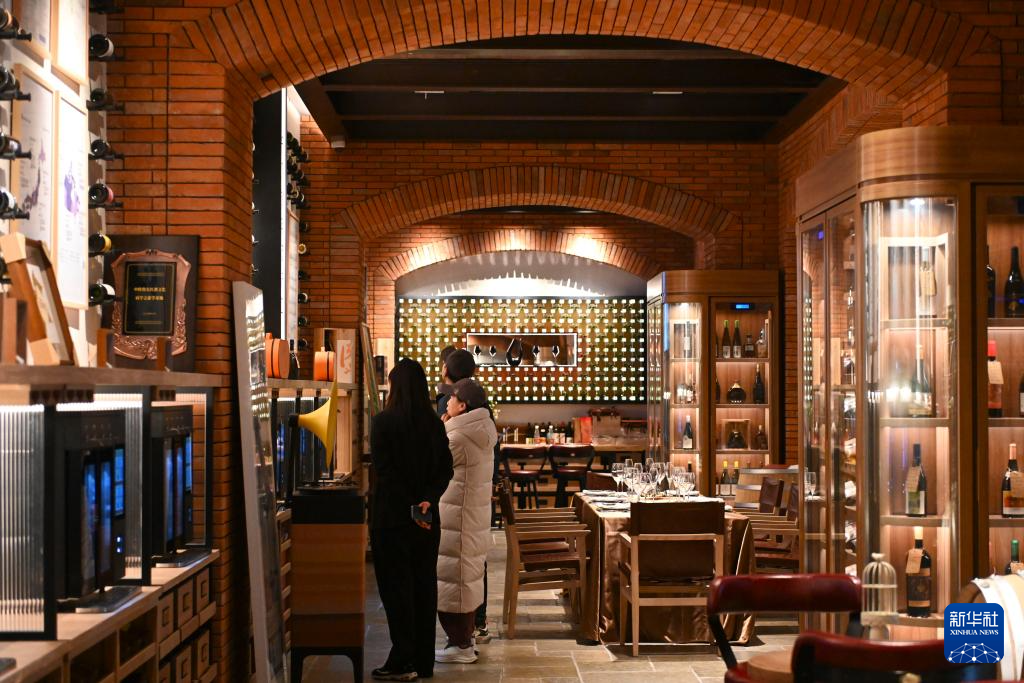 12月24日,游客在位于宁夏银川市的图兰朵葡萄酒小镇参观葡萄酒廊。
