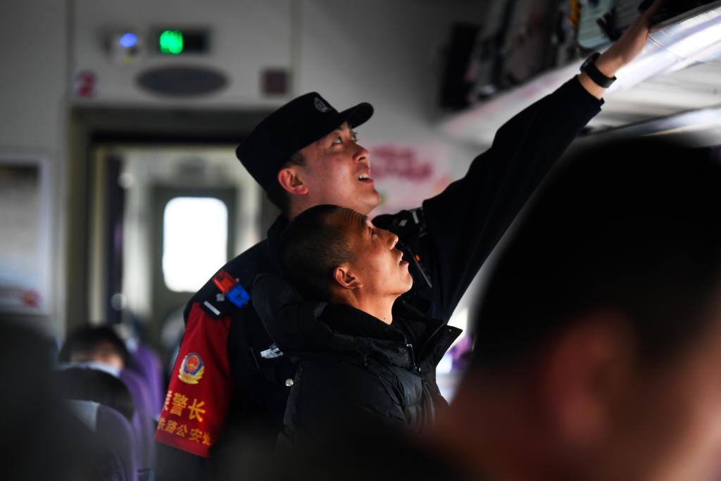 银川铁路公安处乘警支队民警袁帅在列车上检查旅客行李。