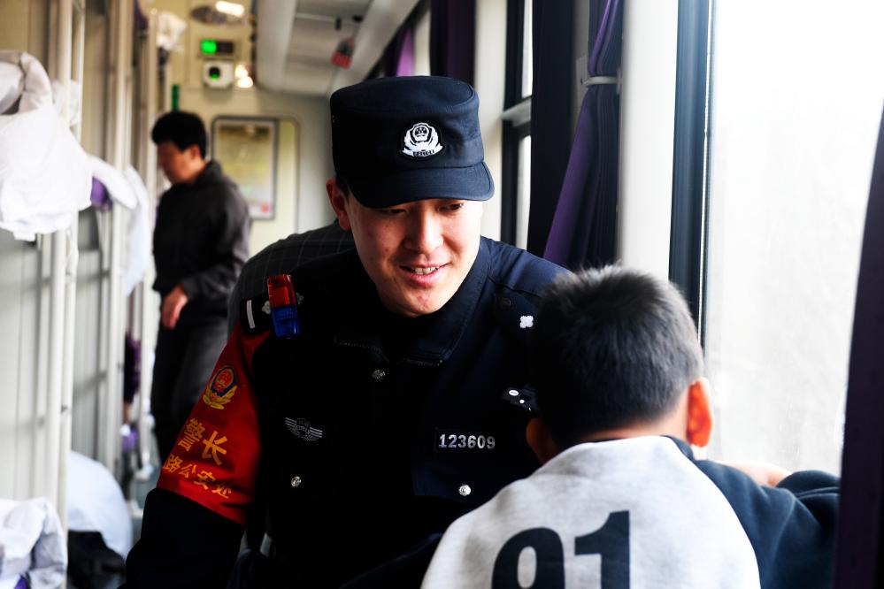 银川铁路公安处乘警支队民警袁帅在列车上与乘客交流。