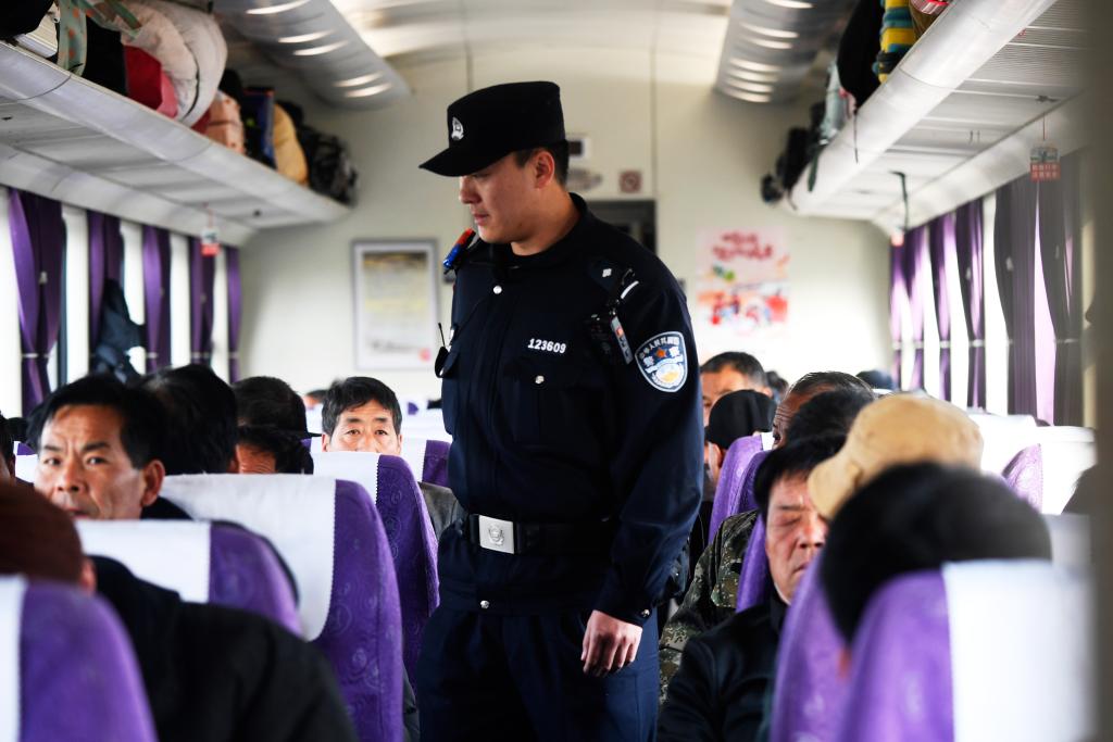 银川铁路公安处乘警支队民警袁帅在列车上巡逻。