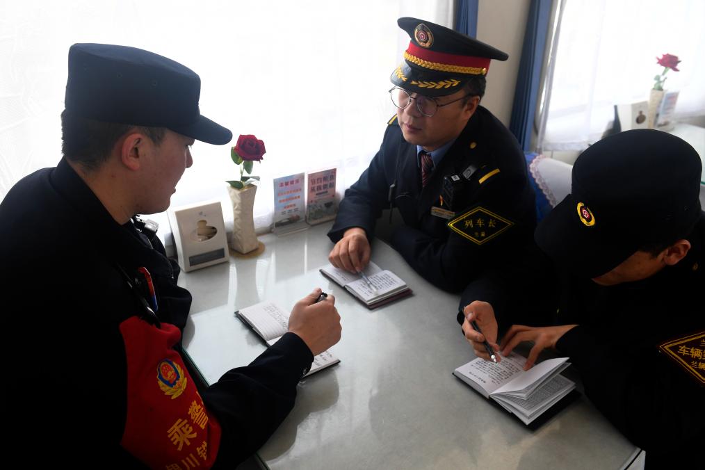 银川铁路公安处乘警支队民警袁帅在列车上与列车长沟通情况。