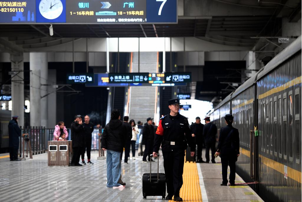 银川铁路公安处乘警支队民警袁帅拉着行李准备上车执勤。