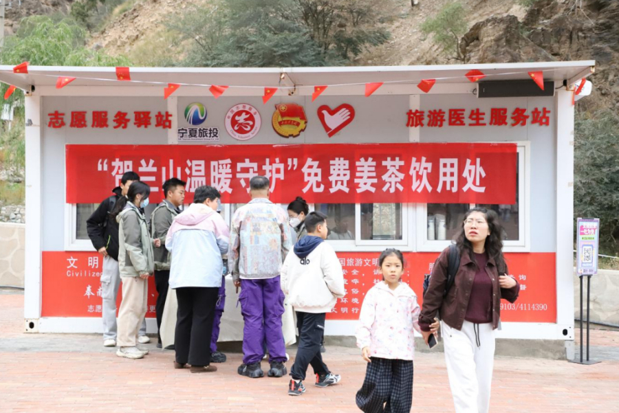 为应对雨天,保障游客安全、舒适游览,贺兰山国家森林公园做足了“功课”。景区在主要乘车点松涛山庄处设立了“暖心服务站”,免费向游客提供热腾腾的红枣姜茶与一次性雨衣。