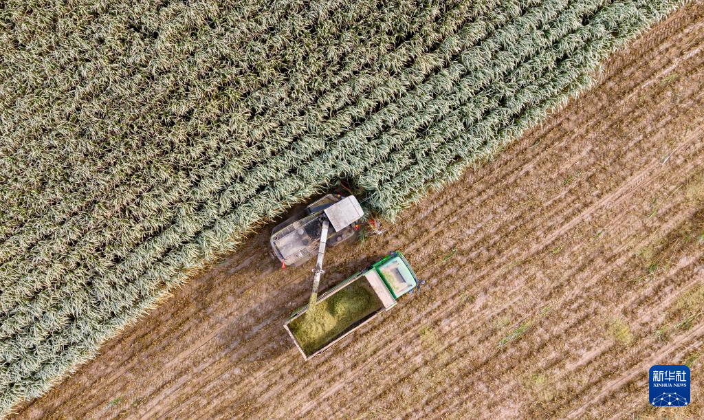 眼下,宁夏银川市永宁县闽宁镇种植的巨菌草进入收割期,当地农户出动机械收获巨菌草,田间一片繁忙景象。据了解,巨菌草收割后将作为青贮饲料,助力当地养殖业的发展。新华社记者 杨植森 摄