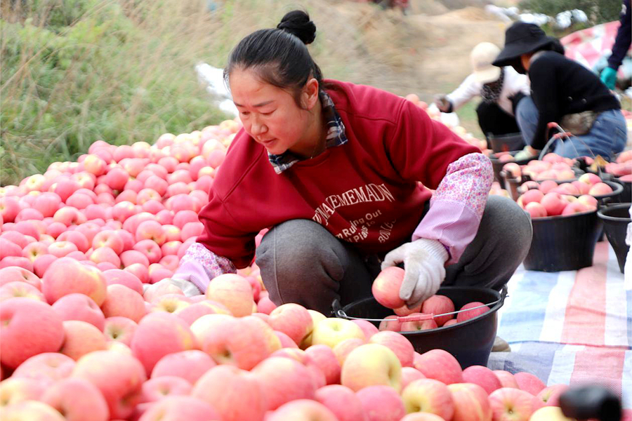 在烽火墩村,1200亩苹果种植基地里,红彤彤的苹果挂满枝头,“以前苹果没地方储存,现在有了冷库,可以错峰销售卖上好价钱!”果农秦鹏飞一边采摘一边说,“我的50亩苹果年收入能有40多万元。”村里建成5座冷链库,通过租赁创收,预计年度增收10万元。“今年苹果行情好,是个丰收年,大家都高兴!”烽火墩村党支部书记马超望着累累硕果笑容满面。预计全村的苹果今年亩产达6000斤,商品果占比超65%,亩均效益突破1万元,实现了从“种得好”向“卖得好、收益高”的转变。