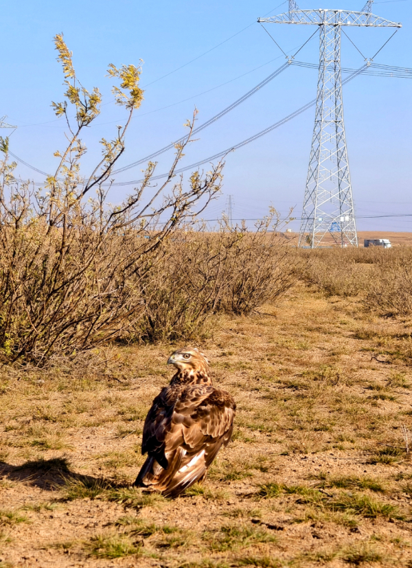 “这鸟看着像大鵟,是国家保护动物!”巡检人员立刻回忆起国网宁夏超高压公司此前组织的野生动物保护宣传培训内容,曾详细讲解过鹰类的外形特征、生活习性及保护级别,其标志性的灰褐色羽毛、锐利的喙部与爪子,与眼前的动物高度吻合。意识到这是国家二级保护动物且处于受伤状态,巡检人员不敢怠慢。经仔细观察发现大鵟翅膀有伤,羽毛略显凌乱,推测可能是意外撞击或捕食时不慎受伤,导致无法飞行。