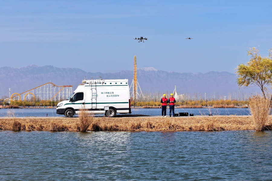 11月12日,在宁夏回族自治区银川市金凤区,国网银川供电公司输电运检中心员工利用大疆M350及M4智能无人机设备对110千伏花安线进行线路巡视、红外监测,保障输电线路安全运行。袁宏彦 摄