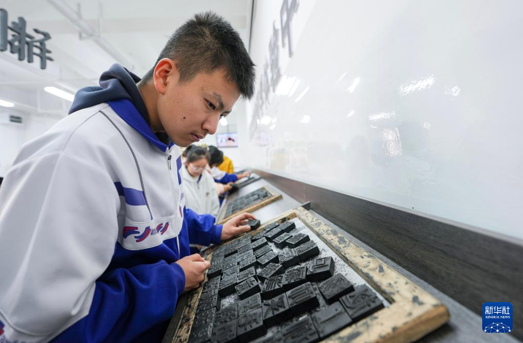 11月14日,宁夏银川市第二十四中学高一学生在西夏陵国家考古遗址公园内体验木活字印刷。