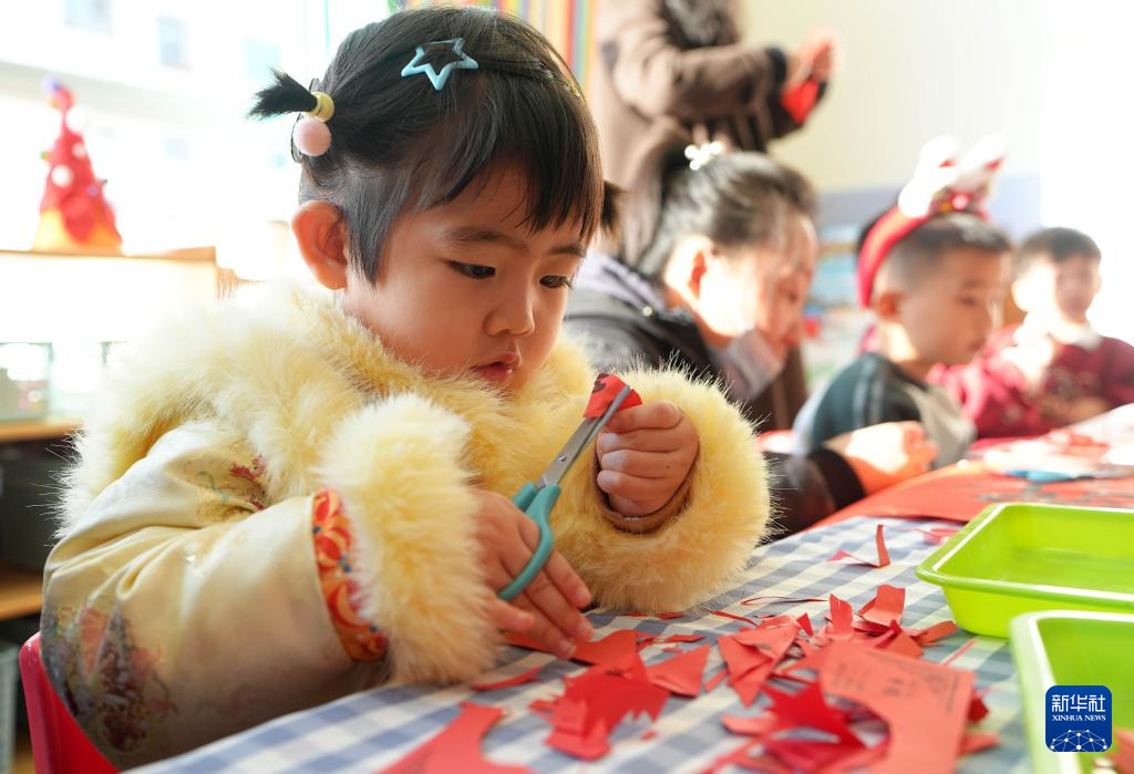 新年临近,宁夏银川市邮电幼儿园举办“非遗传承 萌宝迎新年”活动,邀请醒狮、剪纸、糖画、川剧变脸等非遗项目传承人,现场为孩子们带来展演体验活动,让孩子们近距离感受中华优秀传统文化。新华社记者 王鹏 摄