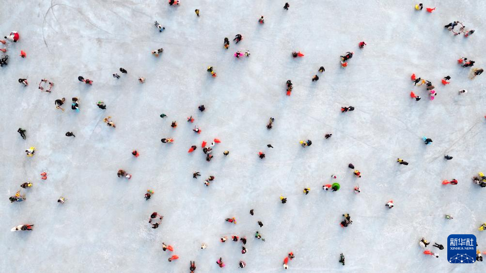 1月17日,市民在银川文旅集团览山公园落日冰场游玩(无人机照片)。