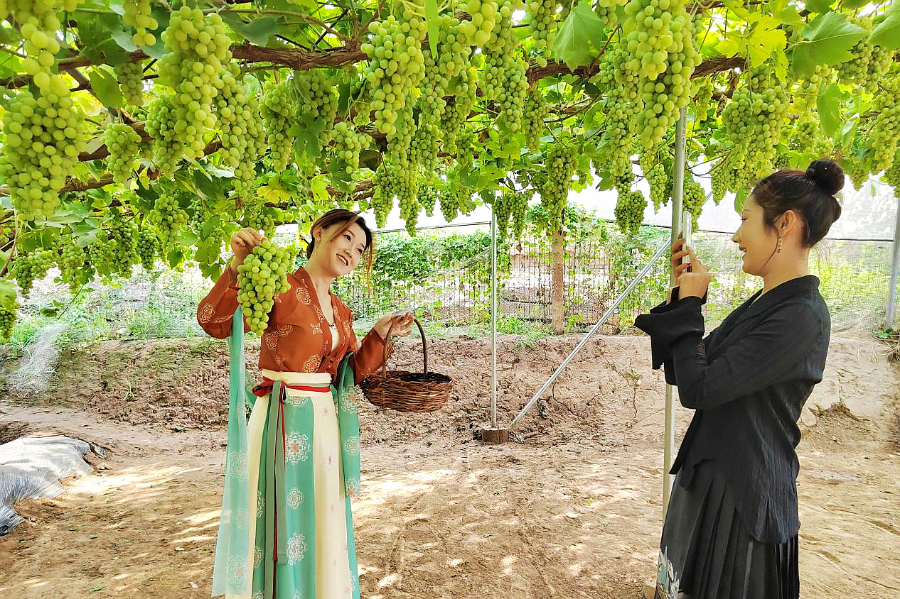 欣欣向荣的葡萄产业不仅鼓起了群众“钱袋子”,也让乡村振兴事业更具活力。“现在一年到头都有活干,从冬剪到展藤,再到疏果、采摘,收入也稳定多了。”正在田间劳作的村民贺生千说。(王欣惠)