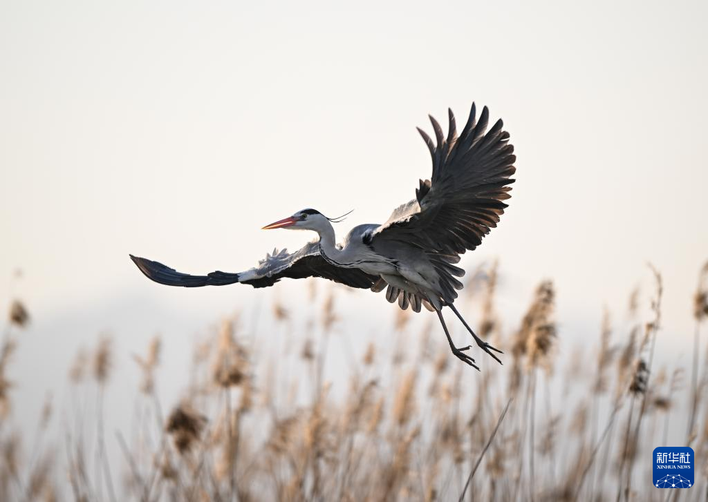4月17日,一只苍鹭在沙湖芦苇丛中展翅飞翔。新华社记者 冯开华 摄
